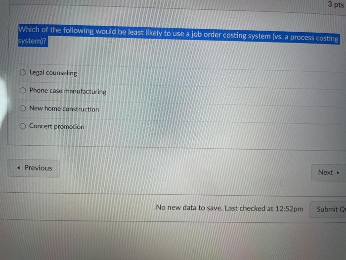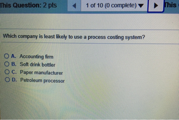 Job costing involves the detailed accumulation of production costs attributable to specific units or groups of units. One example of a company that will least likely use a process costing system is a company that is in charged or associated with a home builder. Which company is least likely to use a process costing system. Which of the following would least likely use a process costing system. Process costing refers to a cost accounting method that is used for assigning production costs to mass-produced goods. O an oil refinery a chemical company O a home builder O a fertilizer company Next Previous. The Packaging Department started the month with 200 units in process that were 70 complete received 1500 units from the Finishing Department and had 150 units in process at the end of the period.